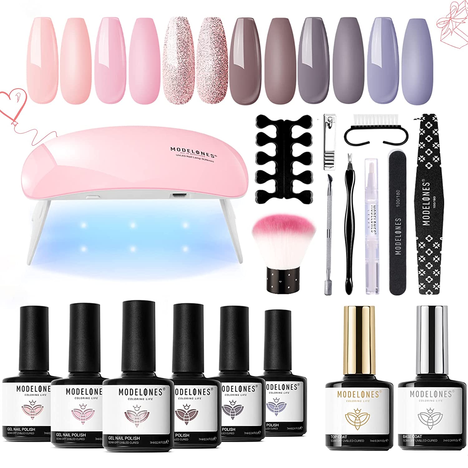 Modelones Gel Nail Polish Kit With Nail Lamp 6 Colors Fingernail Polish Portable Mini Nail Dryer Lamp No Wipe Base And Gel Top Coat Christmas Gift Salon Home Diy Manicure Tools